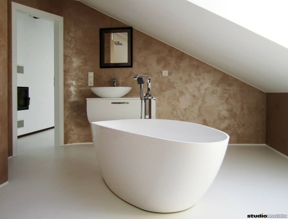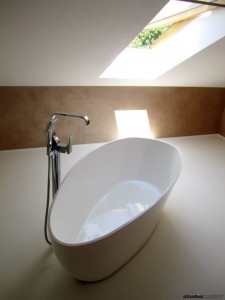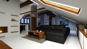 Rekonstrukce půdního prostoru je určena pro mladý pár čekající dalšího člena rodiny. Prostor, omezen dvěma konstrukčními dřevěnými sloupy krovu a komínem uprostřed dispozice, se objemově zvětšil přidáním pultového vikýře v části aktivní zóny bytu. Tedy v kuchyni s jídelním stolem. Vytvoření zakřivené sádrokartonové stěny u hygienického zařízení, vede uživatele plynule od vstupu k obývacímu pokoji. Hygienické zařízení obsahuje jedno samostatné WC a koupelnu se sprchou a vanou umístěnou v prostoru. Klidová zóna je řešena prozatím jako jeden prostor, který se dle potřeby rozdělí skříní na dětský pokoj a ložnici. Stěnu u vstupu mezi schodištěm a obytným prostorem tvoří příčka z napínané fólie s originálním vzorem. Pro podlahovou krytinu v celém bytě byla zvolena litá podlaha na bázi polyuretanových a epoxidových pryskyřic od firmy AST Systems. Na stěny v hygienickém zařízení byla použita dekorativní stěrka.